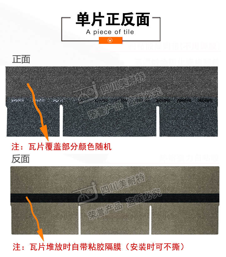 本款产品颜色丰富,立体感强,一般适用于广泛应用于高档别墅、高档小区、政府安置工程,学校工程等工程,产品可自由裁剪,能成功覆盖于不同形状和不同基层的屋顶。适用屋面坡度从15°到90°不同建筑。