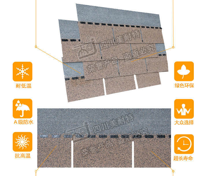 本款产品颜色丰富,立体感强,一般适用于广泛应用于高档别墅、高档小区、政府安置工程,学校工程等工程,产品可自由裁剪,能成功覆盖于不同形状和不同基层的屋顶。适用屋面坡度从15°到90°不同建筑。