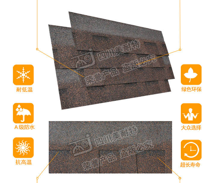 本款产品颜色丰富,一般适用于广泛应用于高档别墅、高档小区等工程,产品可自由裁剪,能成功覆盖于不同形状和不 同基层的屋顶。适用屋面坡度从15°到90°不同建筑。