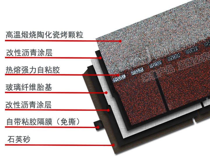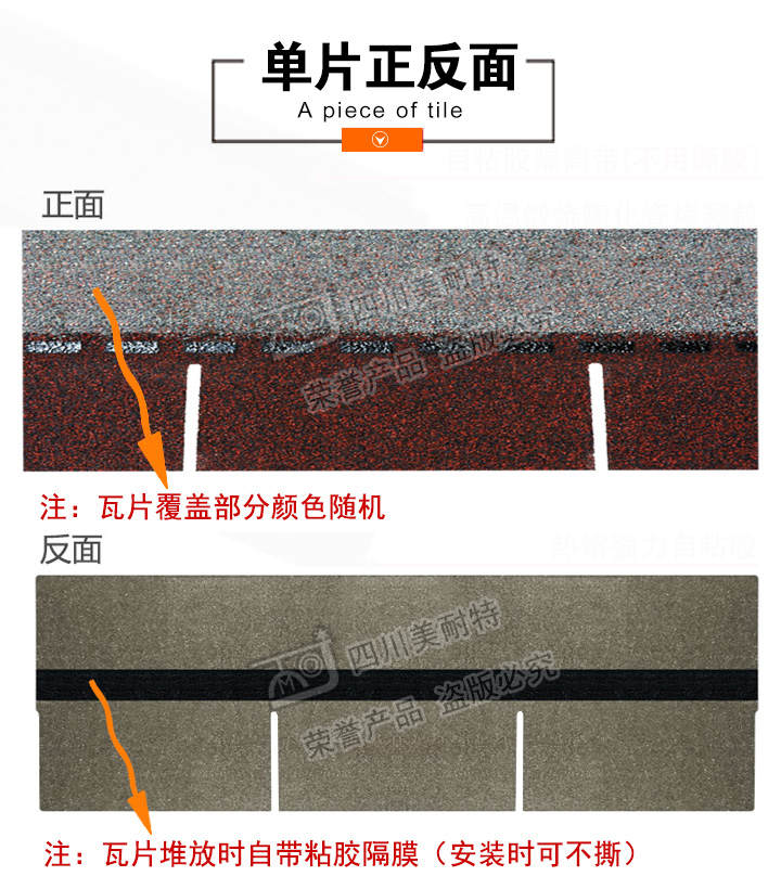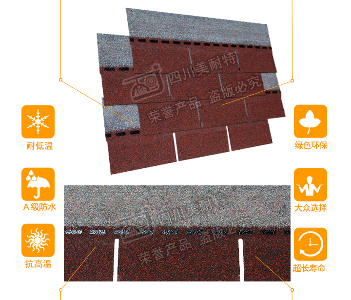 本款产品颜色丰富,立体感强,一般适用于广泛应用于高档别墅、高档小区、政府安置工程,学校工程等工程,产品可自由裁剪,能成功覆盖于不同形状和不同基层的屋顶。适用屋面坡度从15°到90°不同建筑。