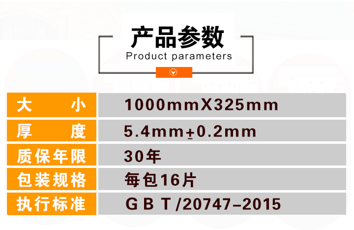 宽度(mm):340mm 厚度(mm): 5.2mm 重量(kg/m2):每包28KG±1KG 每平方米所需瓦片(片):6.8片